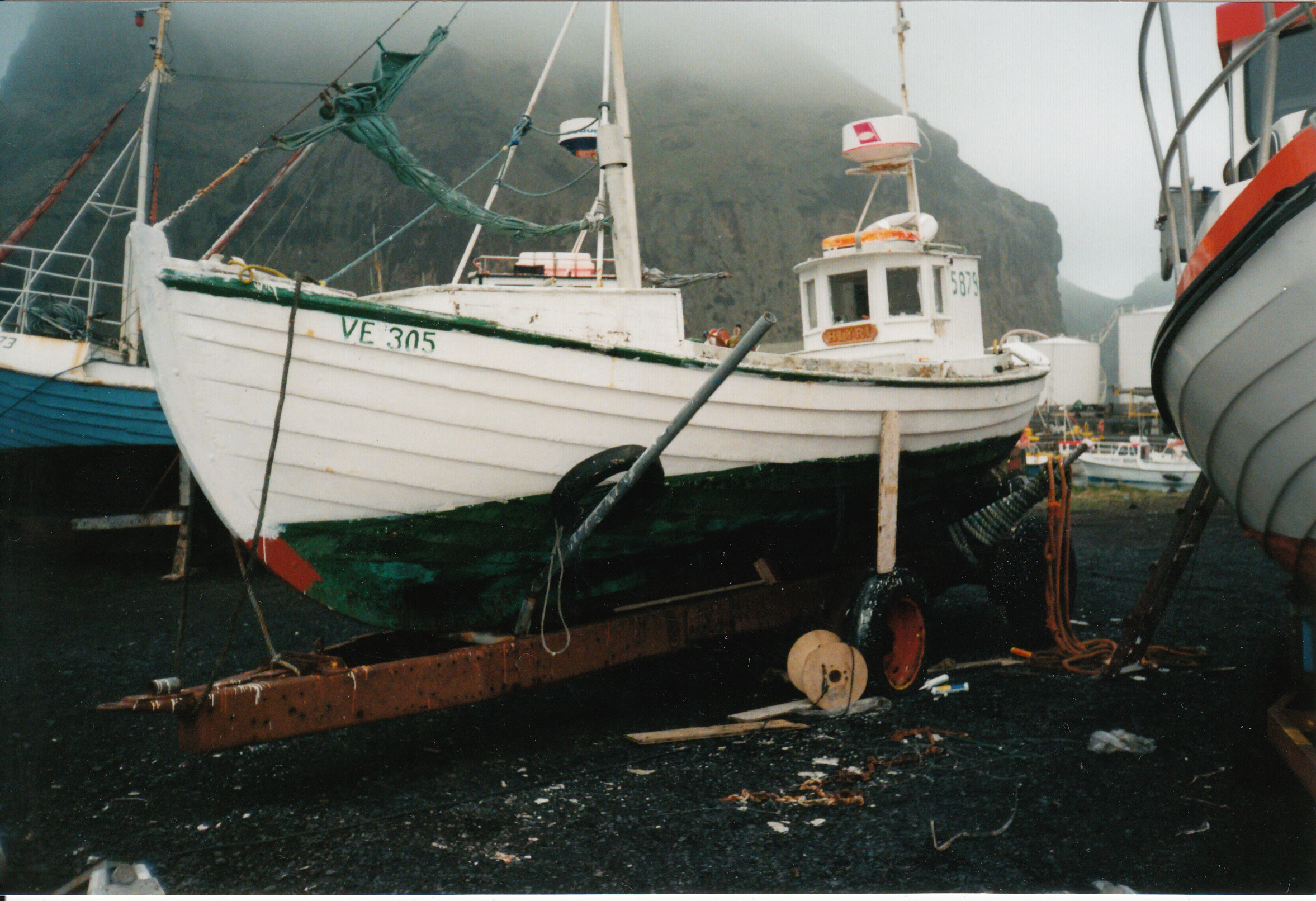 Tré og plastbátar á landi í Eyjum